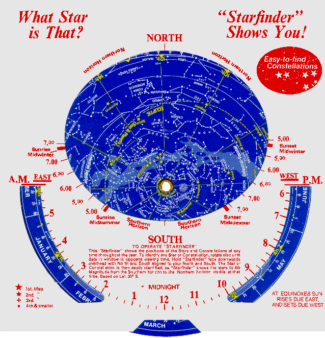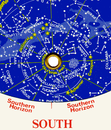 Above is a star finder designed for viewing from 35° S latitude, for example, in Perth, Adelaide, Melbourne, Sidney (Australia) or Auckland (New Zealand). On this Star Finder the eyelet is the south celestial pole (SCP), which is shown 35° above the southern horizon. (The north celestial pole is below the horizon in the southern hemisphere of the Earth.) As usual for maps looking up at the sky, east is on the left. The exact point of due east is not marked on the Star Finder, but if you look carefully you'll see the spot where the celestial equator hits the horizon, near the spot marked 6.00 (am). [Due west is near 6.45 pm on the right hand side.] The date/time is set for 6 am on the December solstice: the start of a summer day. The Sun (on the ecliptic) would be rising in the SE at the point marked Sunrise Midsummer at this moment. Alternatively this same alignment could be used for midnight on the March equinox or 6 pm on the June solstice (winter).