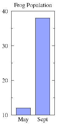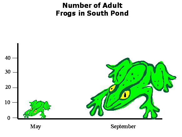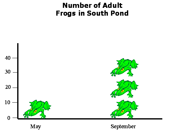 Presumably this graph shows that there were a bit more than 10 frogs in May and something like 40 frogs in September. However, because the frog picture is not regular (and lacks clear and distinct start and stop points) it is impossible to read precise values from the chart. (My best measurement on this chart finds 11.6 frogs in May and 38.2 frogs in September.) At face value the chart suggests that frogs were simply bigger in September than in May... The title may correct that false impression, but still leave the impression of a much bigger change. The frog on the right is about 3× longer and 3× wider than the frog on the left and hence takes up 32=9 times more area (and presumably the eye judges 33=27 times more mass and volume). Thus this sort of diagram leaves the viewer with a distorted view of the actual data: a change much larger than a factor of 3.