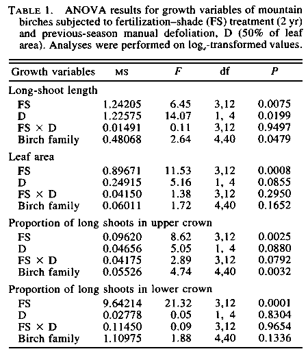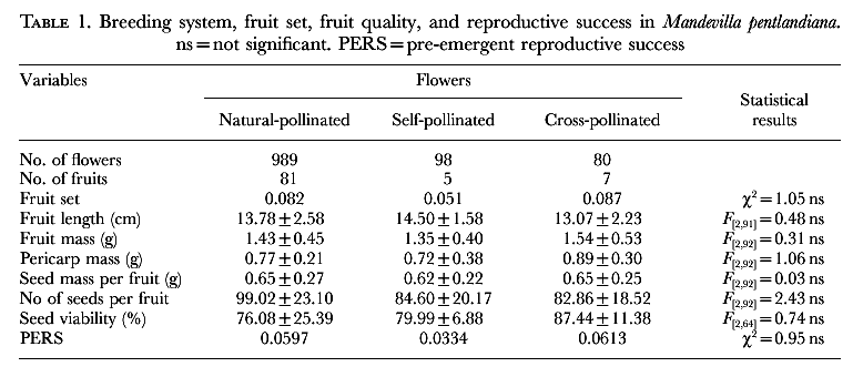 One of the first things you need to decide in making a table is the number of significant digits to display. If a value has a known "error" (e.g., standard deviation, standard error), it is inappropriate to display digits that are well within that error. For example, the first table reports natural-pollinated seed viability as 76.08±25.39. This should have been reported as 76±25; the .08 is totally irrelevant if the range of variation is 25. (It is almost never useful to report more than 2 significant digits of an "error".) If the base number lacks a statistical error, the number of digits reported is often determined by the accuracy of the measurement. Thus masses measured with an analytical balance might be displayed with more digits than masses measured with a triple beam balance. Only rarely is it useful to record more than 4 significant digits. (An astronomical exception: stellar locations are often measured and recorded with extreme precision, say 10 significant digits, because of the importance of unambiguous identification of one object among billions. I'm sure each discipline has such exceptional cases.) One must, of course, report the units of the number. The second table has a tricky case, generally mean squares ("MS") have units, however because of the magic of the logarithm, the units used in this log-transformed MS actually will not effect the value of the mean square, and it is properly reported without units. (F, d.f., and P are all unitless.) It is rarely useful to report more than 2 significant digits of P values or values less than .0001 (probabilities that small are certainly dominated by other effects like human blunders in recording data or an assumption of approximate normalcy). The second table often displays more than two significant digits of P as it is trying to follow another rule of table construction: line up the decimal point in vertical columns of related numbers. The display would have been more effective if the insignificant digits had just been left as blanks. The first table shows that "ns" (not significant) results are still worth reporting. Note, however, that terms like "not significant" do not have a precise mathematical meaning -- different people and disciplines have adopted different standards. Be sure to define in the text or table caption what you have adopted as a definition for significant.