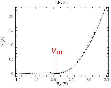 The defining parameter -- the transconductance g or yfs -- is not at all constant. To the extent that the drain current depends quadratically on the gate voltage, the transconductance -- which is the derivative: dID/dVG -- depends linearly on VG above threshold. Below is the measured relationship: ID vs VG for the above 2N7000. Notice that for VG>VTO, the drain current is well approximated by the quadratic, whereas for VG<VTO (i.e., sub-threshold) the drain current depends approximately exponentially on VG. Thus the drain current is not strictly zero below threshold, merely exponentially small.