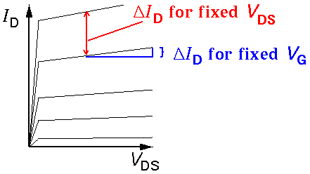 The characteristic curves focus on the output of the transistor, but we can also consider the behavior of the input. In normal operation the gate is separated by an insulating layer from the rest of the transistor, and so IG is essentially zero (which should sound like a huge input resistance). As a result the outputs have little effect on the inputs, but if we follow the traditional analysis the actual functional relationship giving the gate current (IG) from the gate voltage (VG) and drain-source voltage drop (VDS) is some complicated function which we can denote: