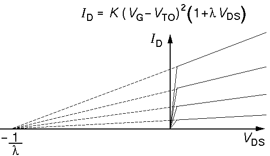 A slightly more complicated approximation takes into account the sloping of the characteristic curves. In bipolar transistors this is due to the Early Voltage, here a very similar equation results from quite different physics: channel length modulation. The equation looks like: