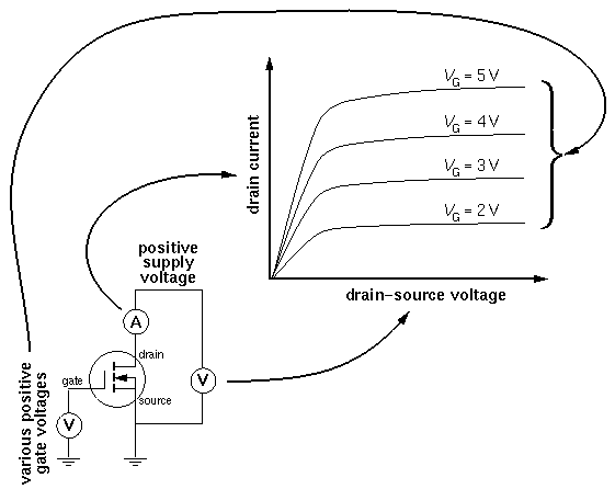 The behavior of an enhancement n-channel metal-oxide field-effect transistor (nMOSFET) is largely controlled by the voltage at the gate (usually a positive voltage). For the usual drain-source voltage drops (i.e., the saturation region: positive voltages from a few volts up to some breakdown voltage) the drain current (ID) is nearly independent of the drain-source voltage (VDS), and instead depends on the gate voltage (VG). (This is unusual behavior: usually more voltage produces to more current, but here the current only increases slightly with increasing VDS.) The transconductance, i.e., the ratio of the change in drain current to change in gate voltage, often denoted by g or yfs, is