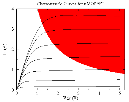 Perhaps the most striking aspect of these curves is the power being controlled by this device. In the upper right hand side of this curve we have a current of .4 A and a voltage drop of 5 V, which is a power dissipation of .4×5=2 Watts -- way beyond the thermal limit of the package (0.4 W). In fact this device did not survive the test. If we display the thermally disallowed region (ID×VDS > .4 W) on top of these characteristic curves you can get a better idea of how this device might be used.